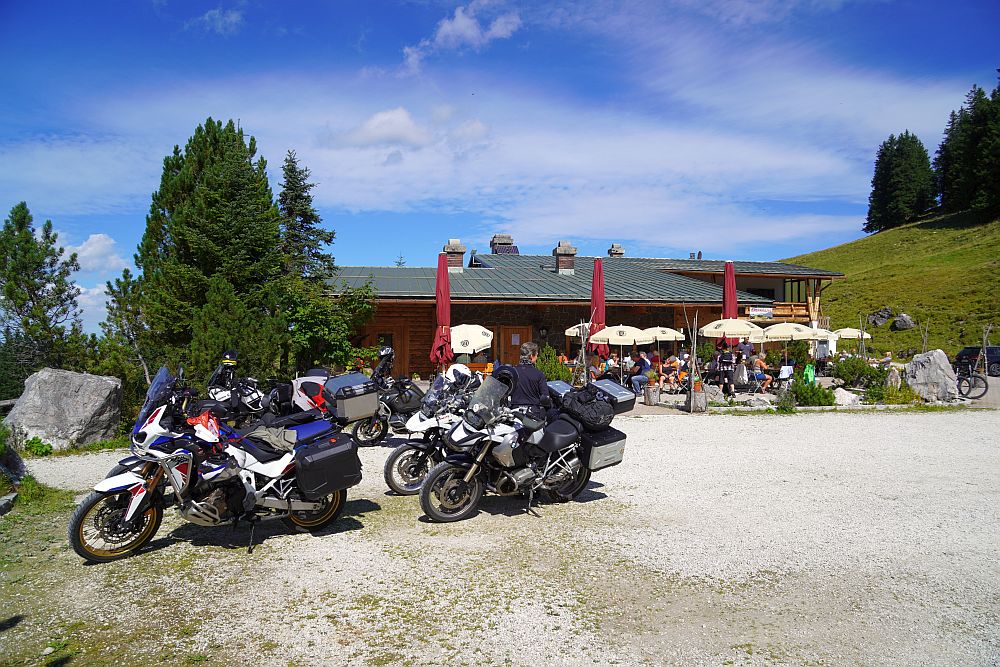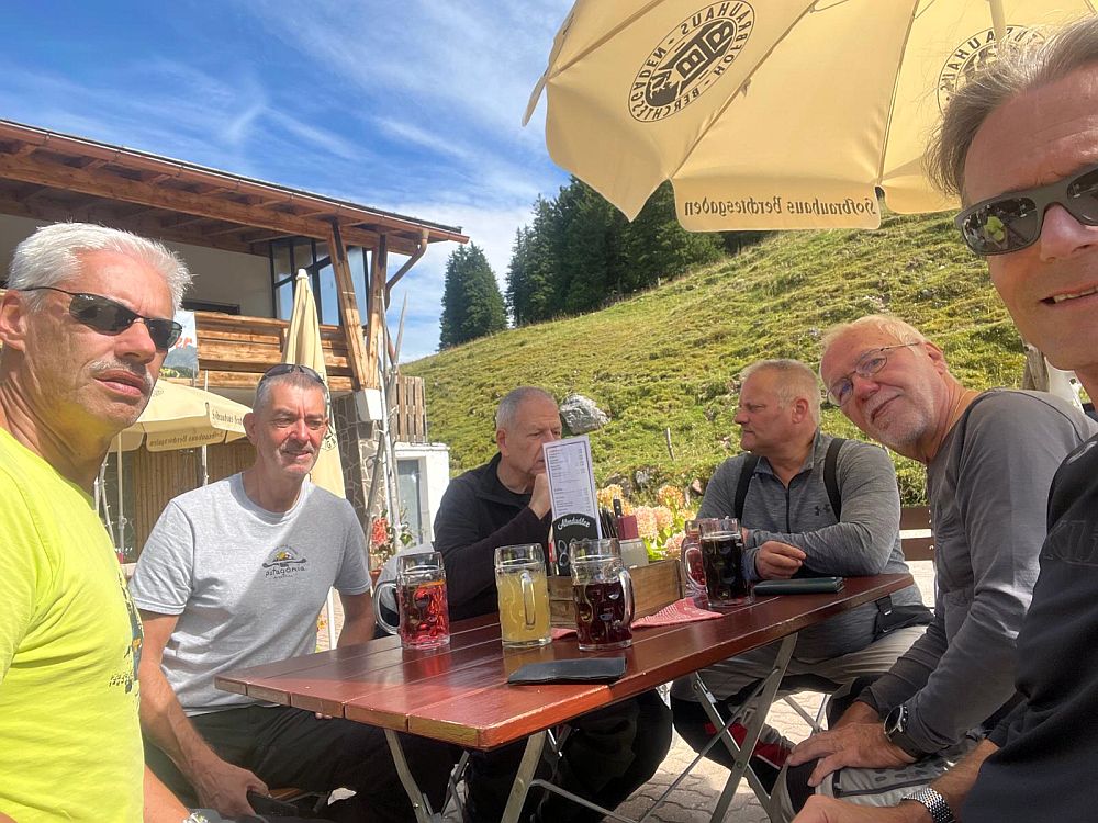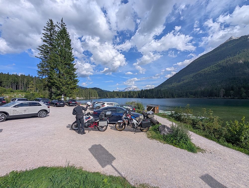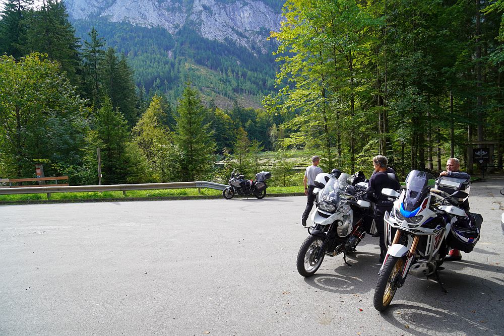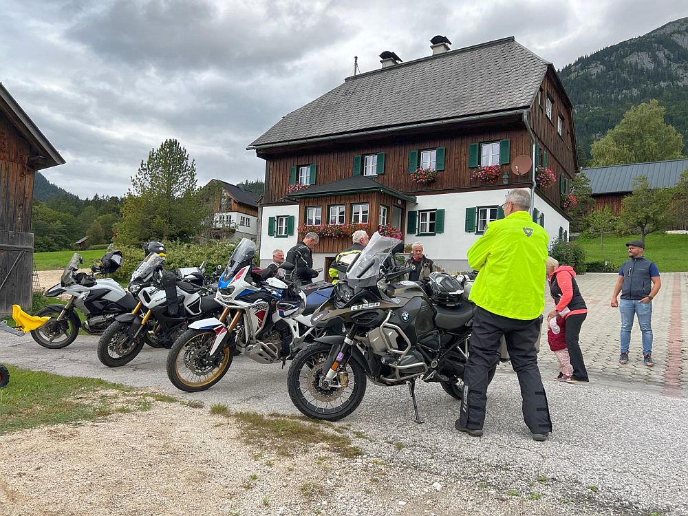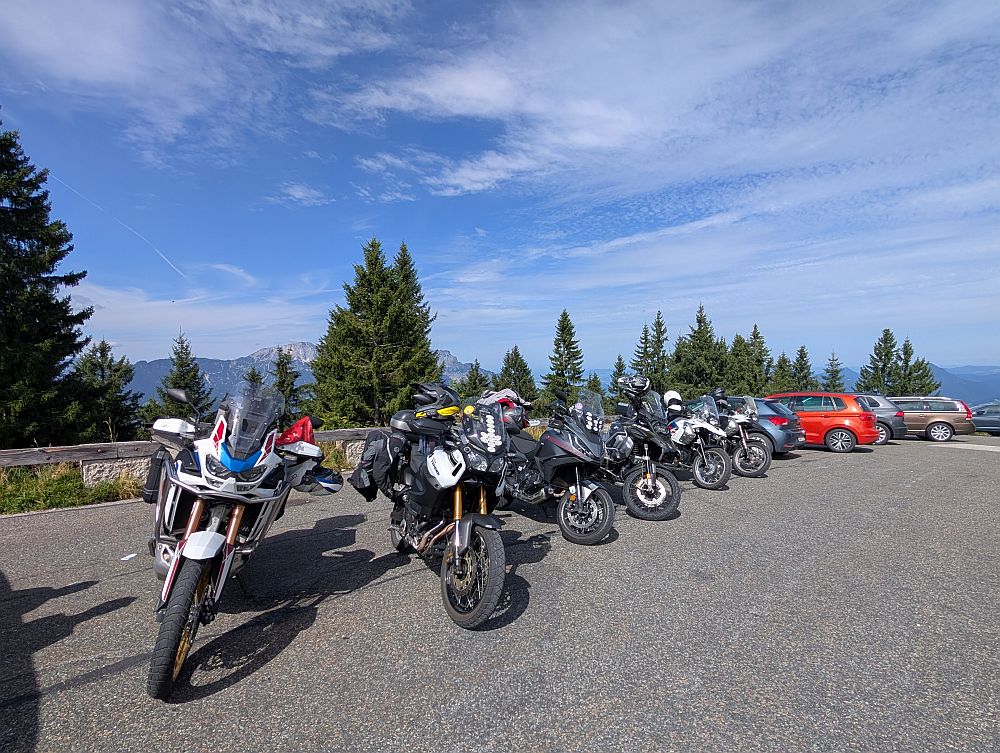 Der Tag der Seen. Traunsee, Attersee, Mondsee, Wolfgangsee. Über die Grenze nach Bayern und hoch auf die Rossfeld-Panoramastraße. Von hier sieht man auf der einen Seite nach Bayern und auf der anderen nach Salzburg. Ewald, Frank und Robert waren 2018 anlässlich der BMW Hüttentour schon mal hier. Mittags auf 1500m beim Berggasthof Ahornkaser eine Weisswurst, oder was anderes. Den Nachmittagskaffee trinken wir im GH Seeklause am Hintersee. Über Reit im Winkl, Walchsee, Thiersee statt über die Tatzelwurmstrasse (die ist in der Richtung aus der wir kommen für Motorräder gesperrt) kommen wir nach Bayrischzell. Die Hotelsuche ist hier schwierig. Erst im dritten Hotel werden wir fündig. Zum Abschluß des Tages noch ein Bier aus dem Hotelkühlschrank.