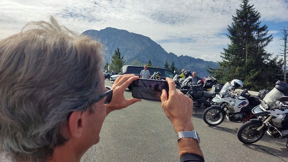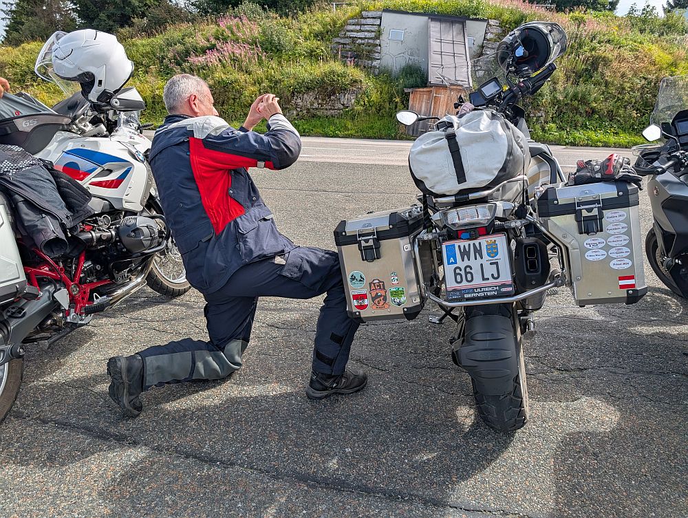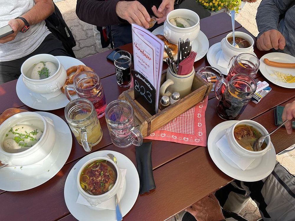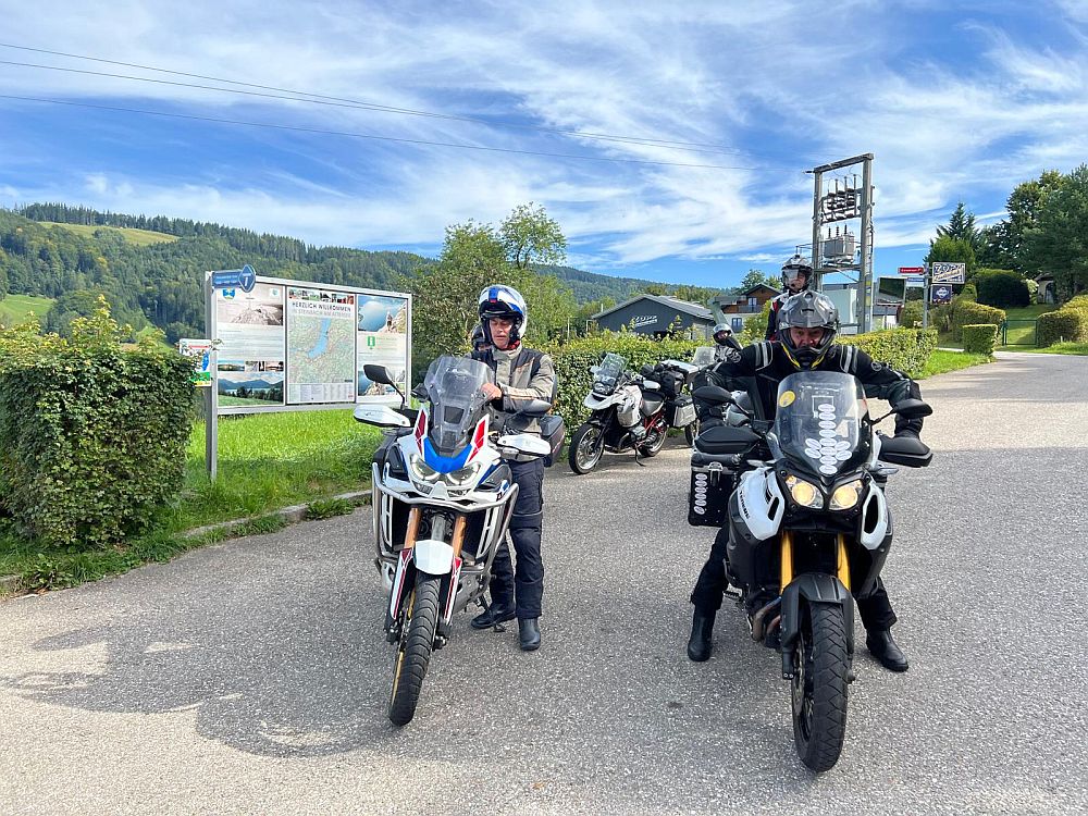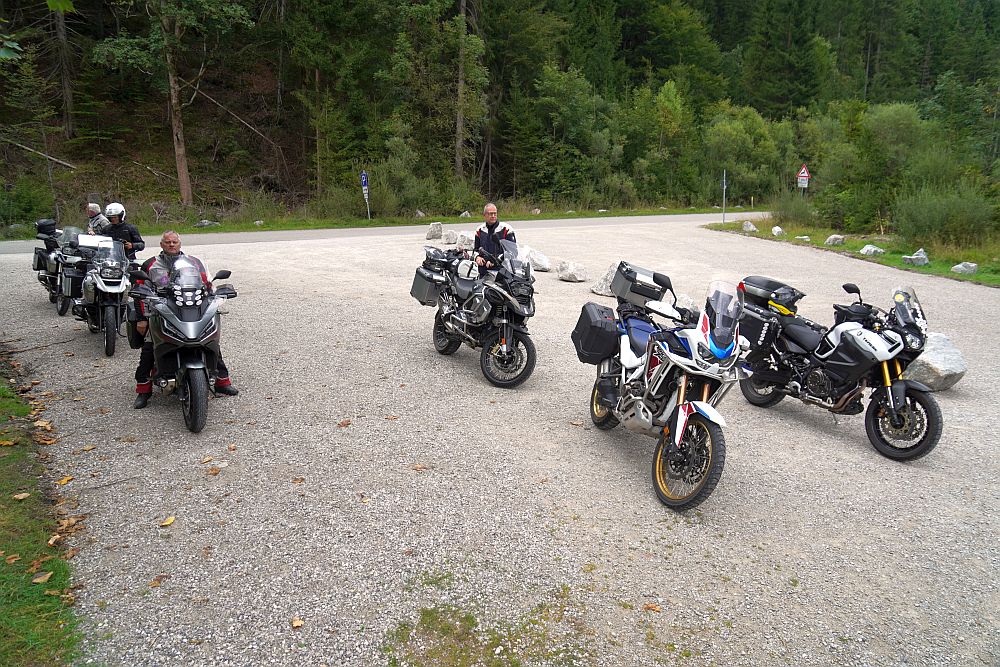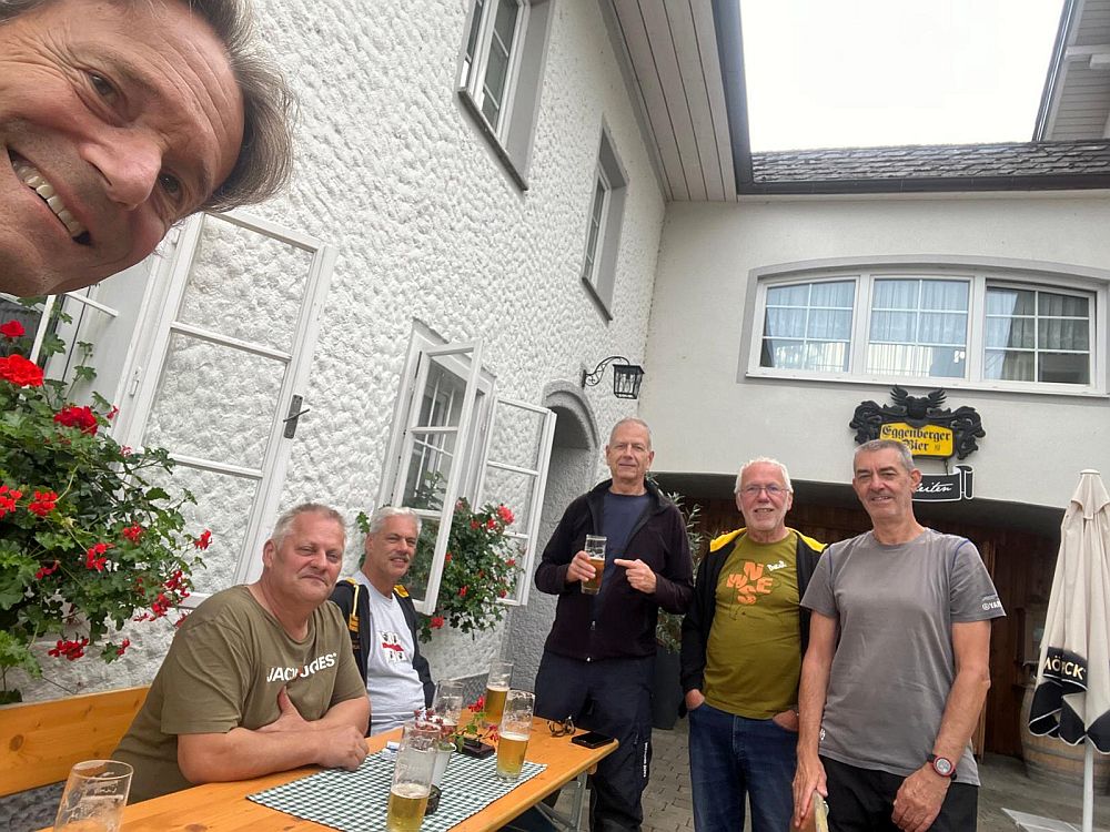 Der Tag der Seen. Traunsee, Attersee, Mondsee, Wolfgangsee. Über die Grenze nach Bayern und hoch auf die Rossfeld-Panoramastraße. Von hier sieht man auf der einen Seite nach Bayern und auf der anderen nach Salzburg. Ewald, Frank und Robert waren 2018 anlässlich der BMW Hüttentour schon mal hier. Mittags auf 1500m beim Berggasthof Ahornkaser eine Weisswurst, oder was anderes. Den Nachmittagskaffee trinken wir im GH Seeklause am Hintersee. Über Reit im Winkl, Walchsee, Thiersee statt über die Tatzelwurmstrasse (die ist in der Richtung aus der wir kommen für Motorräder gesperrt) kommen wir nach Bayrischzell. Die Hotelsuche ist hier schwierig. Erst im dritten Hotel werden wir fündig. Zum Abschluß des Tages noch ein Bier aus dem Hotelkühlschrank.